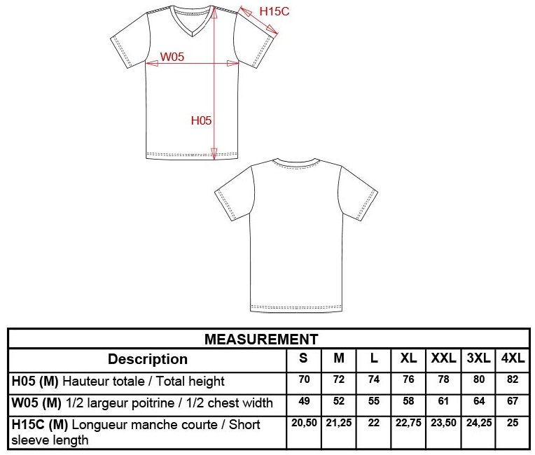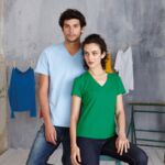 Glatt eingefasster V-Ausschnitt, Nackenband in Kontrastfarbe bei farbigen und weiss bei weissen Shirts, Doppelnähte, 40° waschbar, trocknergeeignet bei niedriger Temperatur, nicht chemisch reinigen