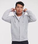 Cotton faced fabric. Brushed back fleece. Drop shoulder style. Double fabric hood with topstitch detail. Flat lace drawcord with buttonhole eyelets. Taped neck. Full length covered YKK zip. Front pouch pockets. Ear phone access. 1x1 ribbed cuffs and hem. Coverseamed around hood, shoulders, armholes, cuffs and hem.