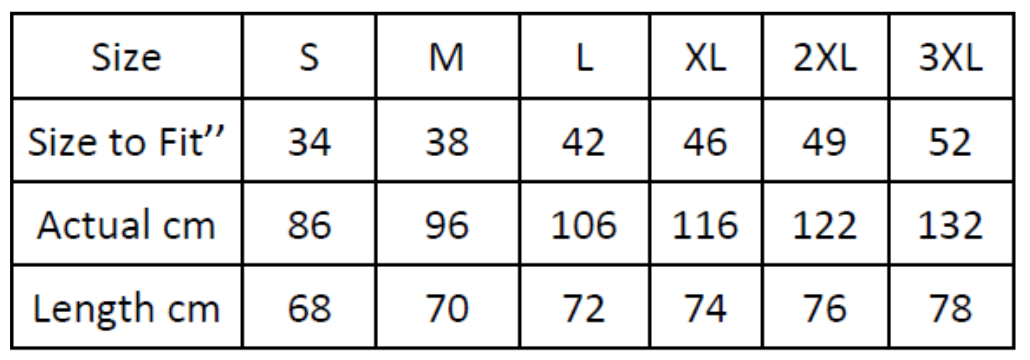 | Size | 32" | 34" | 38" | 42" | 46" | 49" | 52" | 55" | 58" | 61" |
