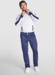 Zweifarbiger Trainingsanzug aus Acetat mit samtigem Futter. Jacke mit kontrastfarbenen Seitenstreifen, Kragen, Armbündchen, Saum und Taschen. Ärmelbündchen und Bund aus 1x1-Rippe. Zentraler Reißverschluss mit Kinnabdeckung. Gerade Hose mit Reißverschluss an der Unterseite. Elastischer Bund und Seitentaschen.